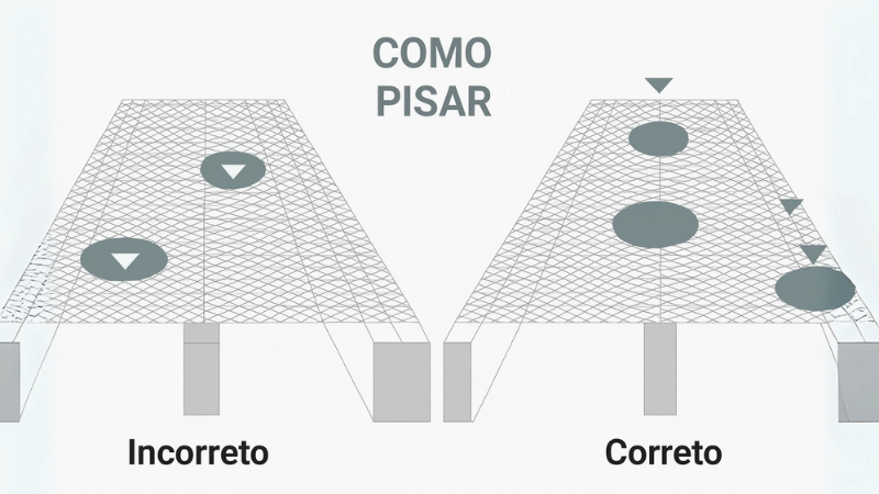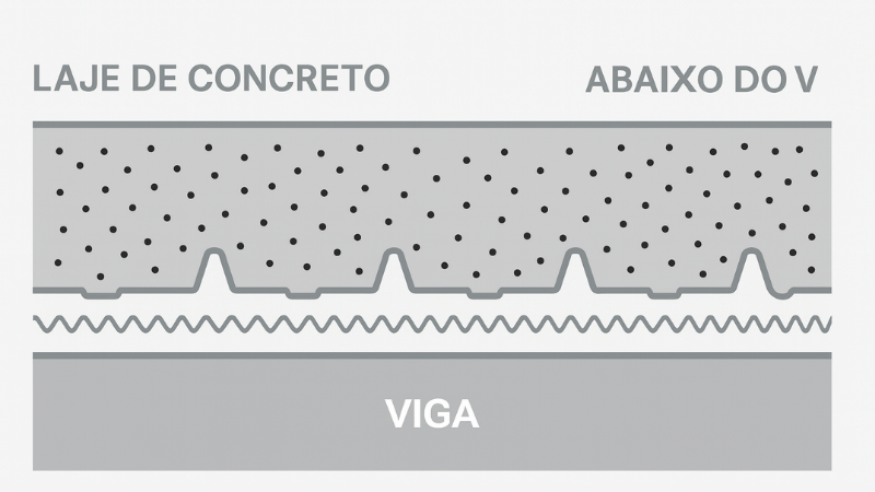 Também é ideal para coberturas de tetos das mais variadas formas: inclinados, curvos, arcados, etc. Em tetos suspensos, a parte aberta do nervo vai para baixo, que é o lado em que recebe carga reboque, também neste caso, os nervos devem ser perpendiculares à estrutura. A sobreposição das folhas é feita da seguinte forma: Em sentido tranversal montando o útimo nervo de uma folha com o primeiro e, no sentido longitudinal, sobrepondo aprox. 10 cm um do outro, fixando-as entre si a cada 150mm